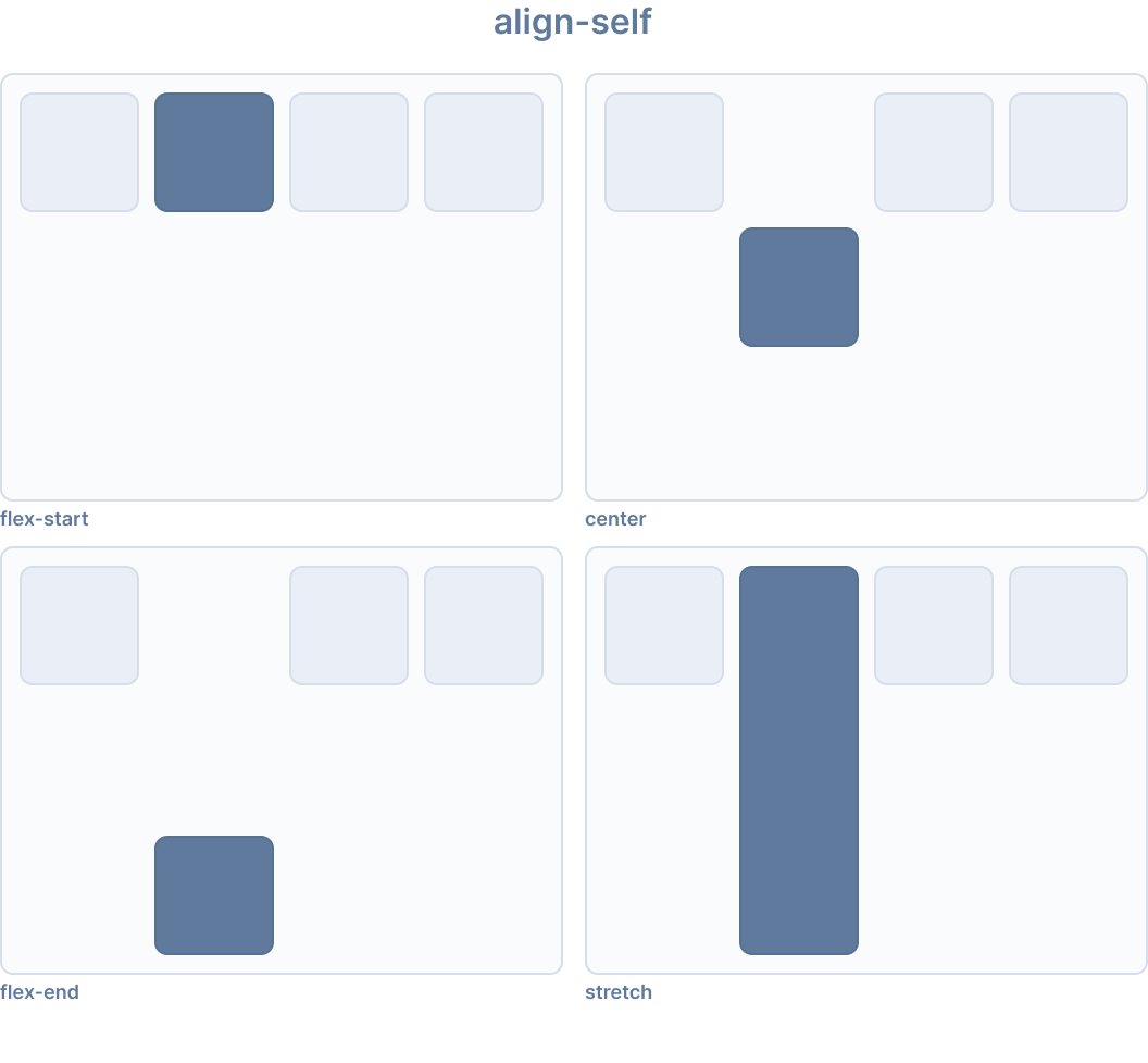 The align-self CSS property overrides a grid or flex item's align-items value. In grid, it aligns the item inside the grid area. In flexbox, it aligns the item on the cross axis.